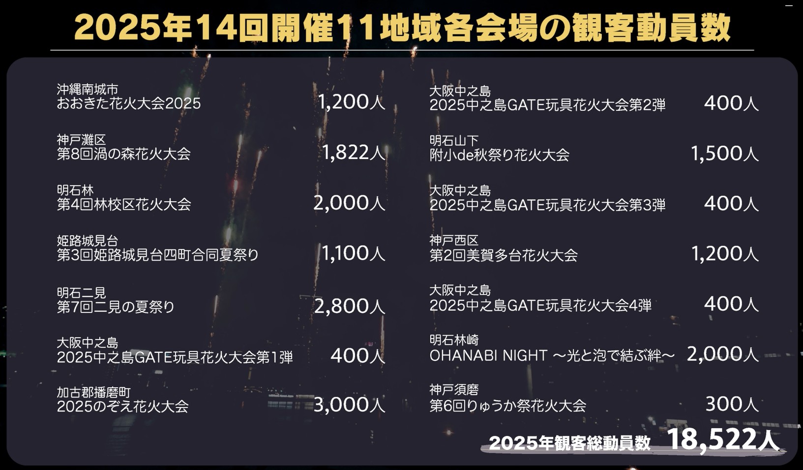 2025年(令和7年)の活動は11地域14箇所で花火大会を開催致しました。 総観客動員数は18522人、各地域の花火師総勢144名が参加しました。